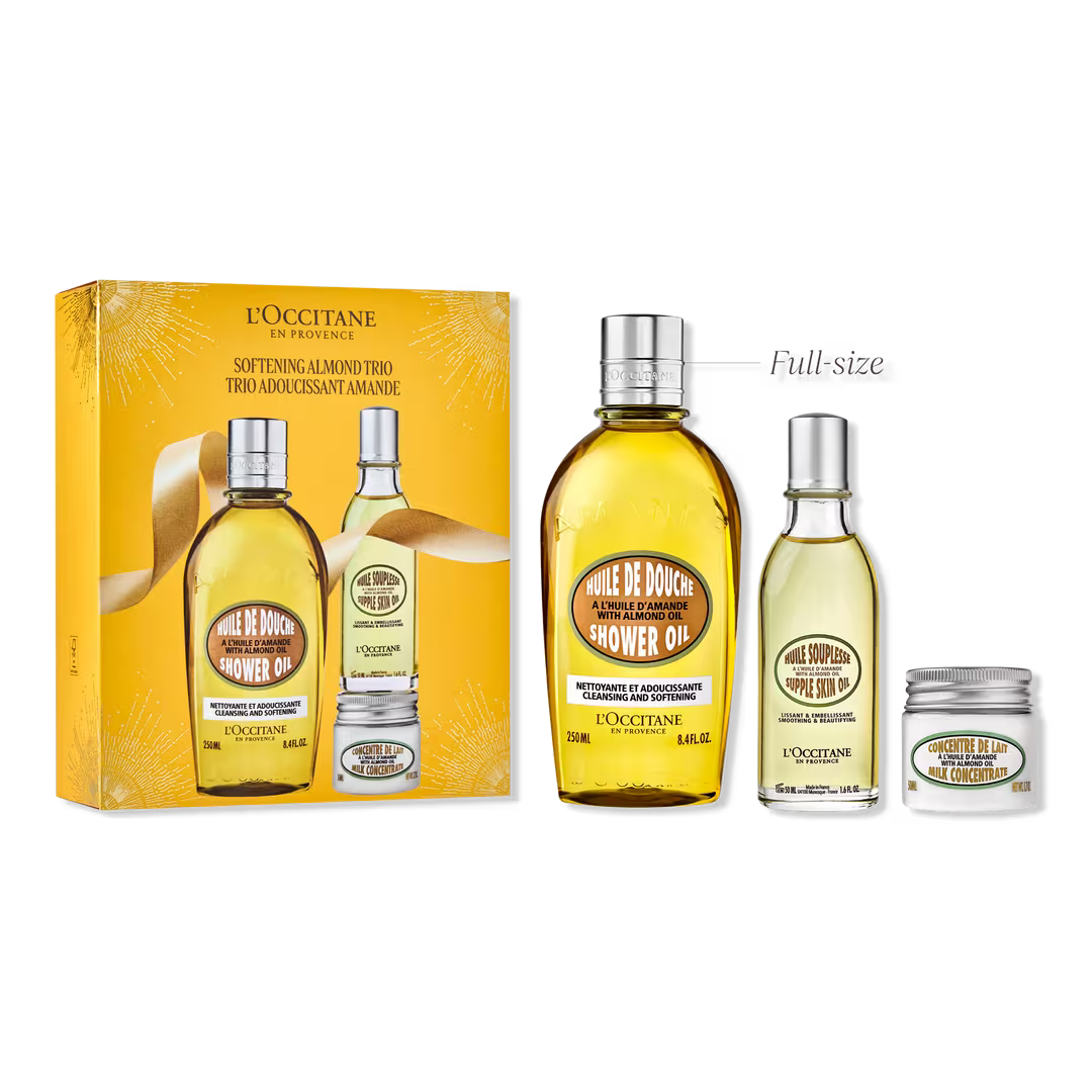 This set features our cult-favorite Almond Shower Oil, which transforms from oil to milky lather when it mixes with water--cleansing, softening, and leaving behind the scent of sweet almonds from Provence. After drying, lock in moisture with Almond Supple Skin Oil and body Almond Milk Concentrate.